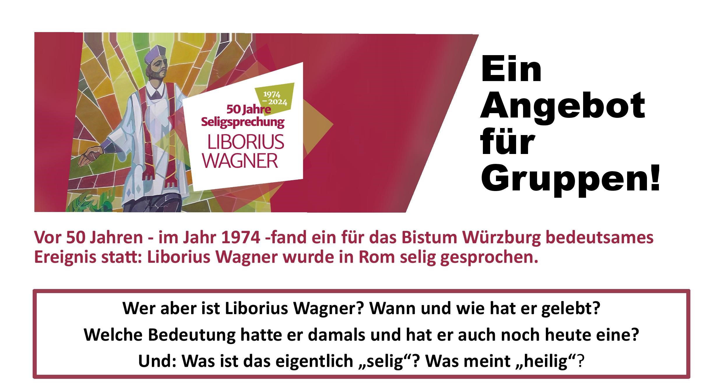 Zusätzlich zu den verschiedenen Angeboten unter "Termine" bieten Diakon Frank Menig und Bildungskoordinator Norbert Kraus - in Kooperation mit der Katholischen Erwachsenenbildung Schweinfurt - ein "buchbares" Seminar (Nachmittag / Abend) an, um interessierte Gruppen über das Leben von Liborius Wagner zu informieren; vor allem aber auch um miteinander zum Thema "heilig" ins Gespräch zu kommen. Bei Interesse kommen Diakon F. Menig oder N. Kraus zu Gruppen vor Ort!