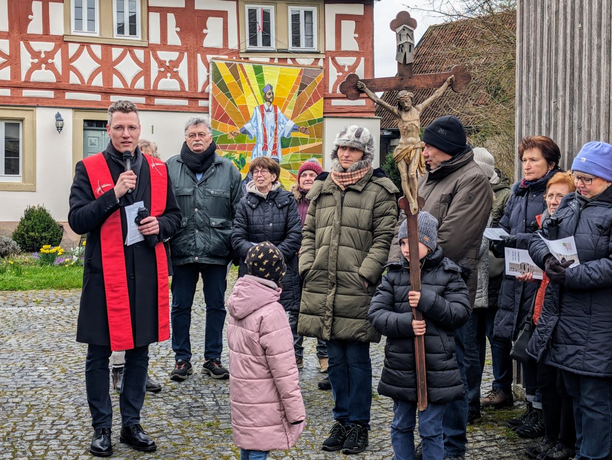 Der Pastorale Raum Schweinfurter Oberland, die Kolpingsfamilie Stadtlauringen und die Pfarrei Altenmünster hatten zum 50. Jahrestag der Seligsprechung von Liborius Wagner (1593-1631) durch Papst Paul VI. im Petersdom dazu eingeladen, heißt es in einer Pressemitteilung. Trotz widrigen Wetters versammelten sich rund 50 Pilger aus verschiedenen Orten vor dem Pfarrhaus Altenmünster, in dem Wagner vor 400 Jahren wohnte. 1974 hatten mehr als 300 Pilger aus dem Bistum Würzburg der Seligsprechung in Rom beigewohnt. Bewusst habe der Kreuzweg zum Jubiläum auf den „Pfaffensteg“ geführt. Seit 1987 stehen entlang dieses Wald- und Flurweges Holzbilder mit dem Kreuzweg Jesu. Der „Pfaffensteg“ führt von Altenmünster nach Sulzdorf. Beide Orte wurden von Wagner seelsorglich betreut, als er von 1626 bis zu seinem Tod 1631 dort Pfarrer war. Der Selige ging regelmäßig diesen Weg, um Gottesdienste zu feiern und Menschen zu begleiten.